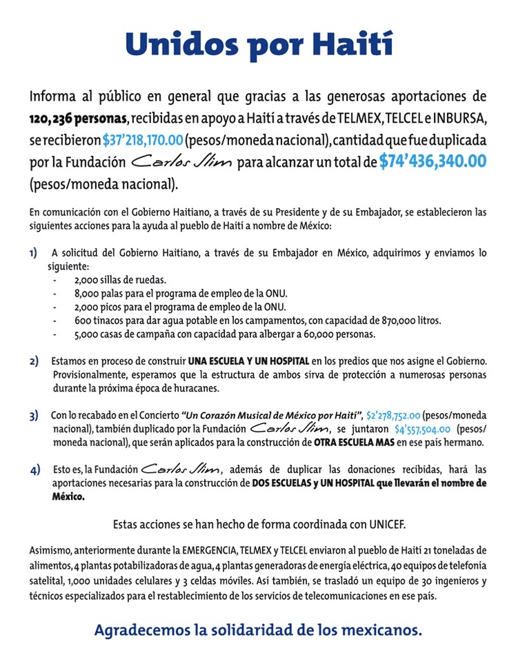 Unidos por Haití informa al público en general sobre las aportaciones recibidas y acciones en apoyo al pueblo de Haití.