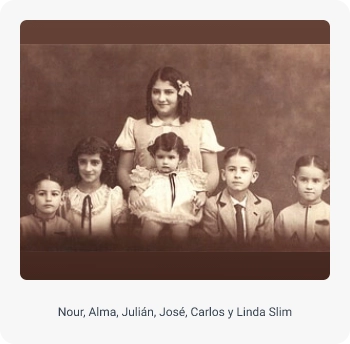 En agosto de 1926 Julián Slim y Linda Helú se casaron en la ciudad de México. Cuatro años más tarde nació su primera hija, Nour, dos años después Alma, después Julián y luego nacieron José, Carlos y Linda.